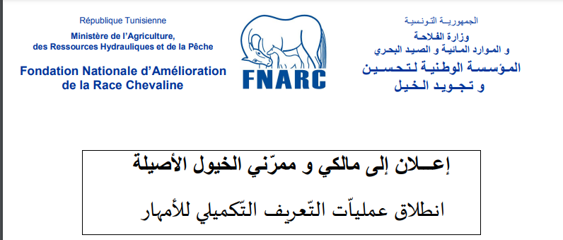 il est porté à la connaissance des propriétaires et des entraineurs de chevaux de races Pur Sang Arabe et Pur Sang Anglais nés en 2022 que les opérations de complément d’identification de ces chevaux pour leur approbation aux courses hippiques se dérouleront à l’Hippodrome de Kassar Saïd et à l'Hippodrome de Monastir, à partir du lundi 02 septembre 2024 de 09 heures à 12 heures.